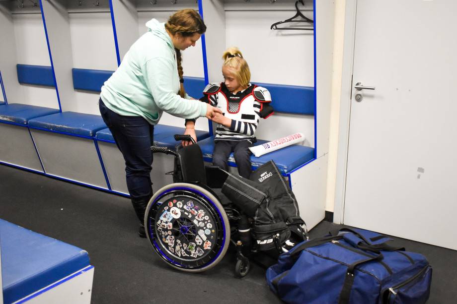 «С мальчиками заниматься не тяжело, они нам помогают. Носят санки, вещи, пропускают вперед. На тренировках занимаемся мы с удовольствием. Расстраиваемся, конечно, если команда проигрывает, но не сильно. Мы мечтаем о том, чтобы дальше играть и выигрывать», – делятся близняшки Софья и Ульяна Наривские из «Red Rocket». У девочек ДЦП, но они очень общительные и приветливые. Первыми встретили меня в раздевалке и принялись жать руку.