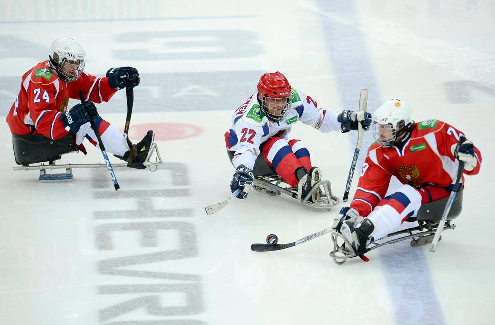 В Москве тренировки по хоккею для слабовидящих регулярно посещают шесть воспитанников специальной коррекционной школы-интерната №2. Чтобы спортсмены с нарушениями зрения могли ориентироваться на поле, используется специальная большая шайба, издающая громкий звук, а у арбитров — свистки с сигналами разной тональности.