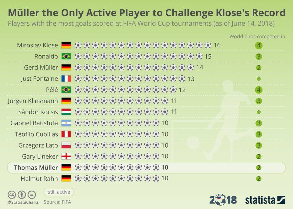 Что касается самого большого количества голов на ЧМ в общем, то тут вне конкуренции Мирослав Клозе. Знаменитый форвард Германии четыре раза сражался за главный кубок планеты. Однако, только в статусе ветерана смог заполучить командный трофей и параллельно поставить личный рекорд – 16 мячей. Бразильский Роналдо вполне мог повторить это достижение, но он провел на один Мундиаль меньше. Результат немца превосходит всех легенд мирового футбола и даже его короля.