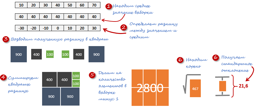 Для начала Excel находит среднее значение выборки. В нашем случае, среднее получилось равным 40, которое на следующем шаге отнимают от каждого значения выборки. Каждую полученную разницу возводят в квадрат и суммируют. У нас получилась сумма равная 2800, которую необходимо разделить на количество элементов выборки минус 1. Так как у нас 7 элементов, получается необходимо 2800 разделить на 6. Из полученного результата находим квадратный корень, это цифра будет стандартным отклонением.