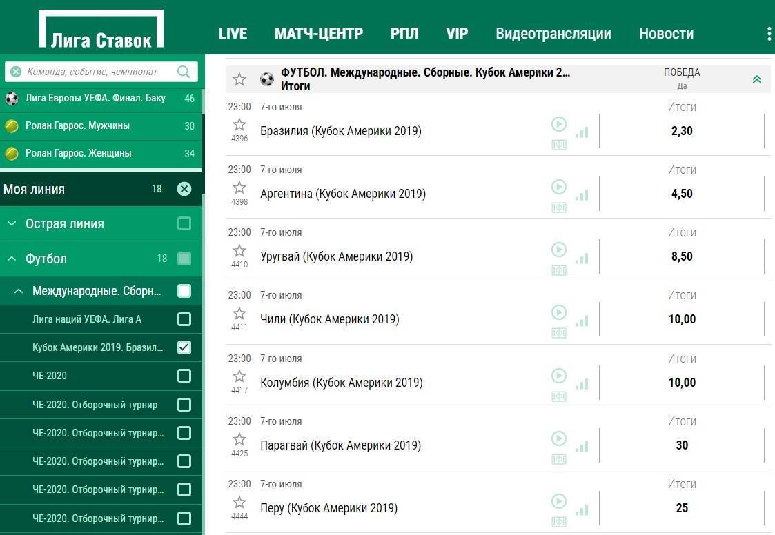В продолжение темы. Букмекерская контора Лига Ставок позволяет заключить пари на триумфатора предстоящего летнего турнира «Кубок Америки 2019». Как видим, фаворитом является Бразилия. Если сегодня поставить на то, что «пентакампеоне» выиграют соревнования, можно поймать коэффициент 2.30.
