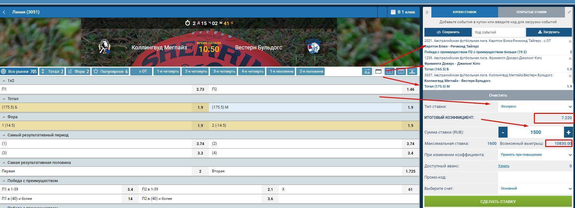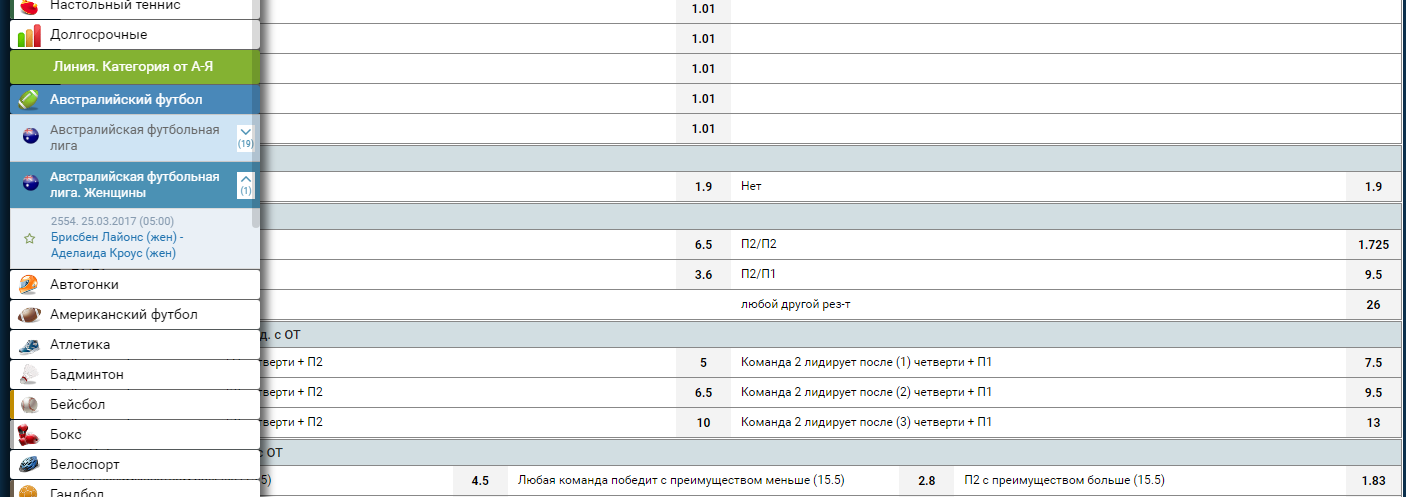 Выбираете в линии спортивных событий категорию «Австралийский футбол» или «Австралия рулз» (зависит от букмекера) и анализируете текущую ситуацию: есть ли матчи с явными фаворитами и андердогами, кто у кого в гостях, какие кэфы предлагают и так далее.