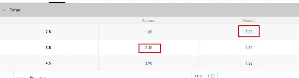 Снова-таки, обращаем внимание на маржу букмекерской конторы, которая не должна превышать 5%. Акцент делаем на рынках с котировками в пределах 2-3: