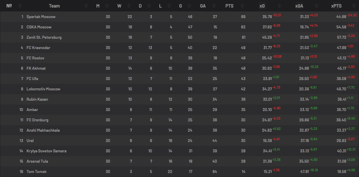Другая крайность – это «оверперформ» (от англ. «overperform» – выступление выше ожиданий). Он возникает тогда, когда команда забивает больше, чем показывает модель xG. Такое часто бывает. Канонический для пример этого явления – «Спартак» образца сезона 2016/17.