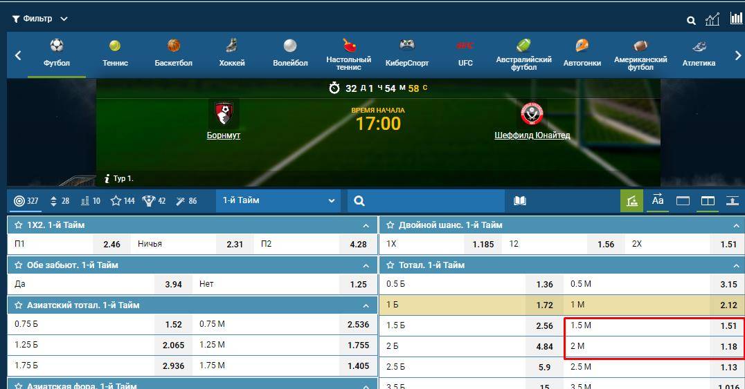 Мы уже рассмотрели ставку на гол в первом тайме, где использовали ставку на ТБ 0.5, но не забывайте, что существует еще ряд исходов, связанных с тоталом, на которых можно неплохо заработать.