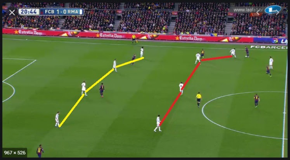 На картинке видно, что мяч у Месси на правом фланге. Две цепи Реала неразрывно сместились в направлении мяча, и везде игроки Реала страхуют друг друга. Если команда грамотно использует схему 4-4-2, её оборону очень трудно взломать.