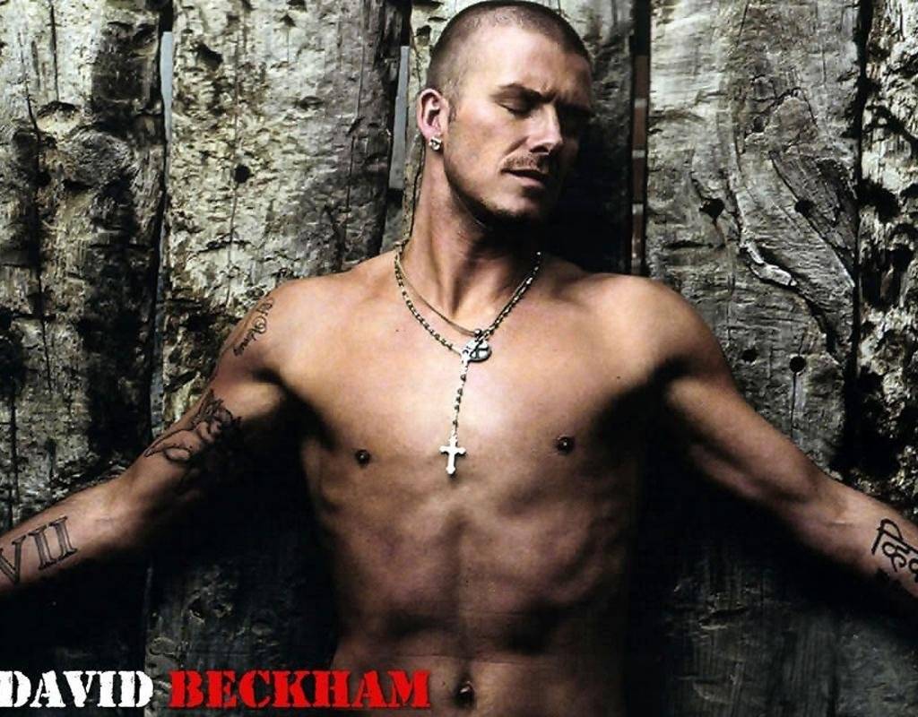 Девид Бекхэм. Татуировки с именем жены Виктории на языке хинди, с именами сыновей в готическом стиле, изображение ангела-хранителя и номер, под которым Девид играет, украшают тело мужчины.