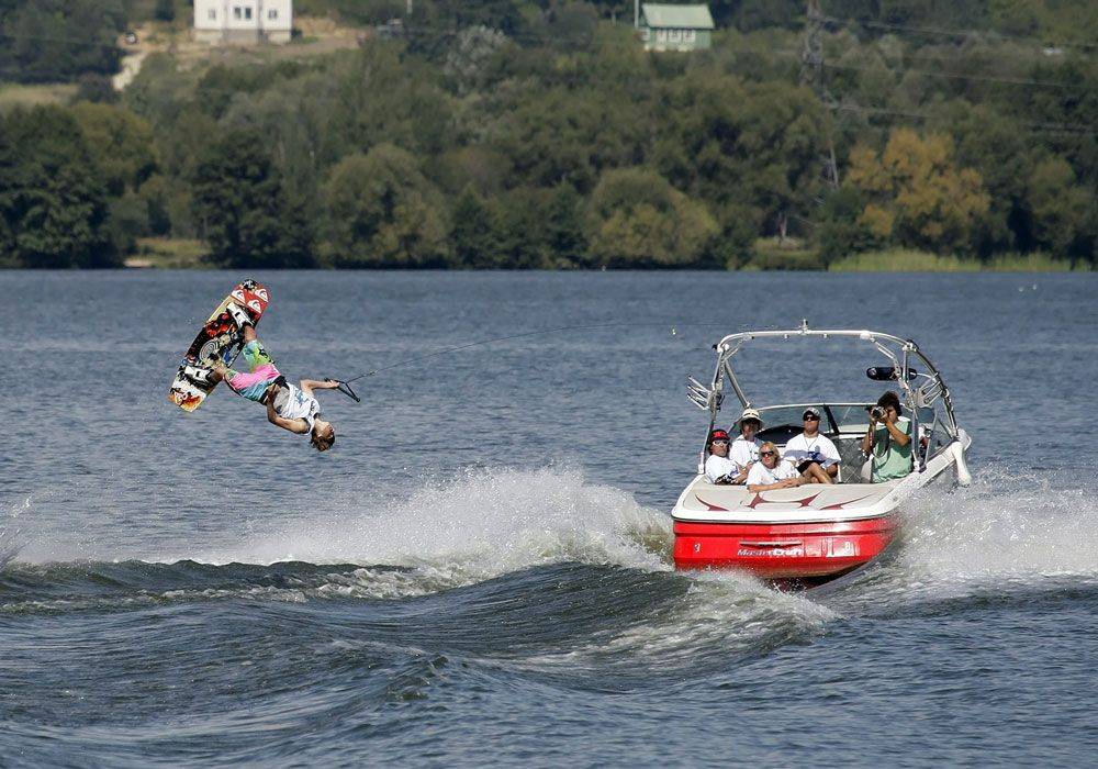 Итак, вас заинтересовал вейкбординг. Что это такое и как все выглядит со стороны? Катер неподвижен, спортсмен с кормовой стартовой площадки спускается в водоем, укладывается на спину, ориентируясь ногами к катеру и удерживаясь за короткий фал (не буксировочный, а пусковой). Когда катер начинает движение, на минимальном ходу фал натягивается, доска фактически прилипает к ногам, и по ускорении спортсмен встает на волну. Ему останется найти баланс и можно либо просто ехать, либо отрабатывать трюки. Новичкам не советуют поначалу слишком увлекаться, настойчиво пытаясь победить волну с первого раза. Обычно рекомендуется делать несколько четвертьчасовых подходов с перерывами на отдых – вейкбординг требует от спортсмена хорошей физической подготовки и силы. Если вы собираетесь им заниматься всерьез, в свободное от осваивания доски время не забывайте о батуте. После отработки прыжков и прочих элементов на нем водные упражнения дадутся гораздо проще, а падений и последующих становлений на волну будет значительно меньше.