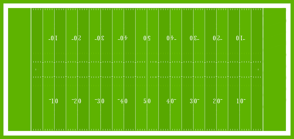 Вот так схематично выглядит поле для американского футбола. Прямоугольники по краям без отметок – зачетные зоны. На само поле наносится разметка, которая помогает понять, на каком удалении от зачетных зон сейчас идет игра.